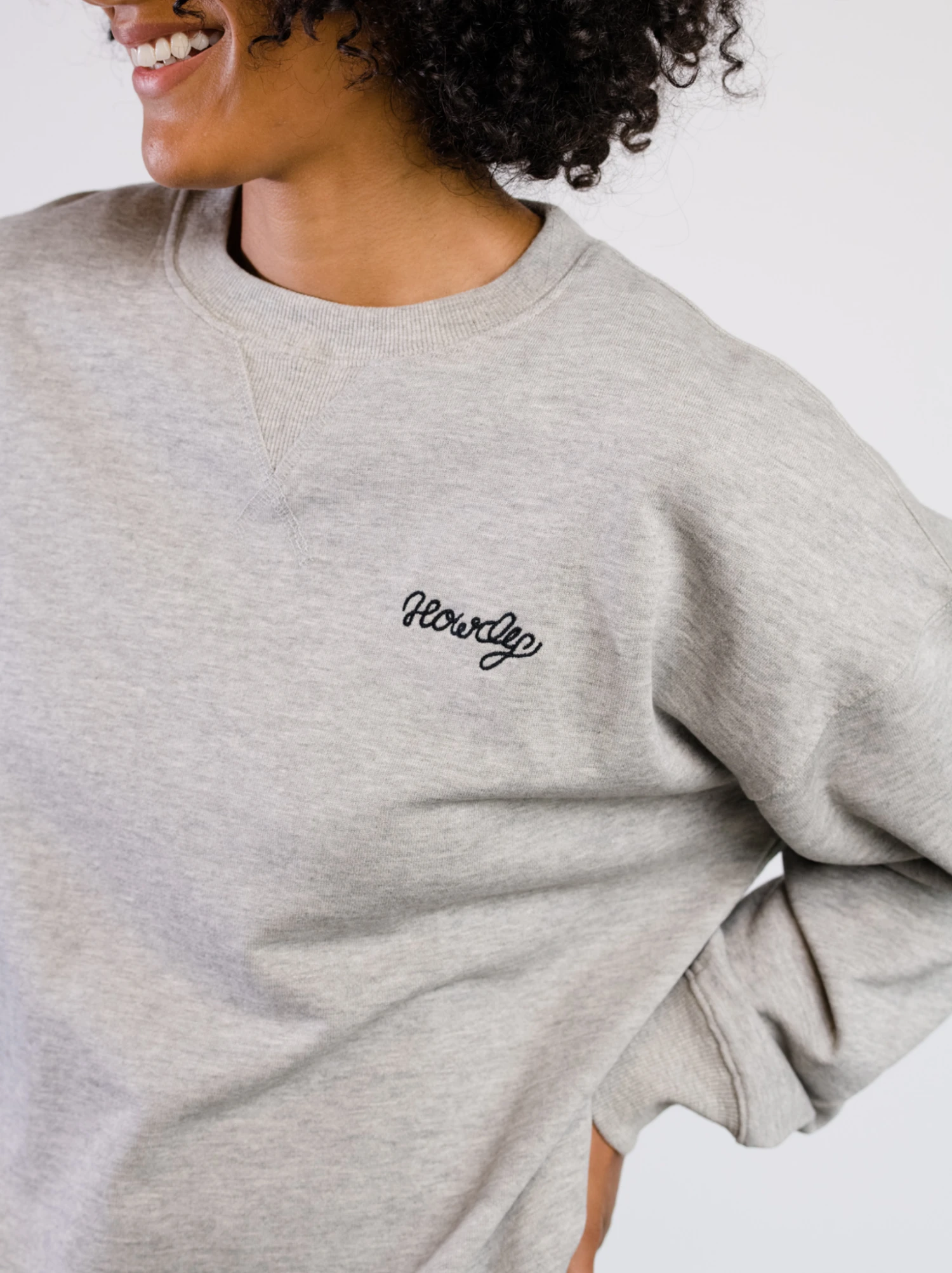 The Ashlee Sweatshirt is an oversized crewneck pullover made from a cozy cotton modal terry blend in a classic heather grey. Featuring ribbed trim at the collar, cuffs, and hem, this sweatshirt promises supreme comfort and durability perfect for lounging at home or running around town. Our favorite part? The embroidered ‘Howdy’ detail, a nod to our beloved hometown of Nashville, TN.