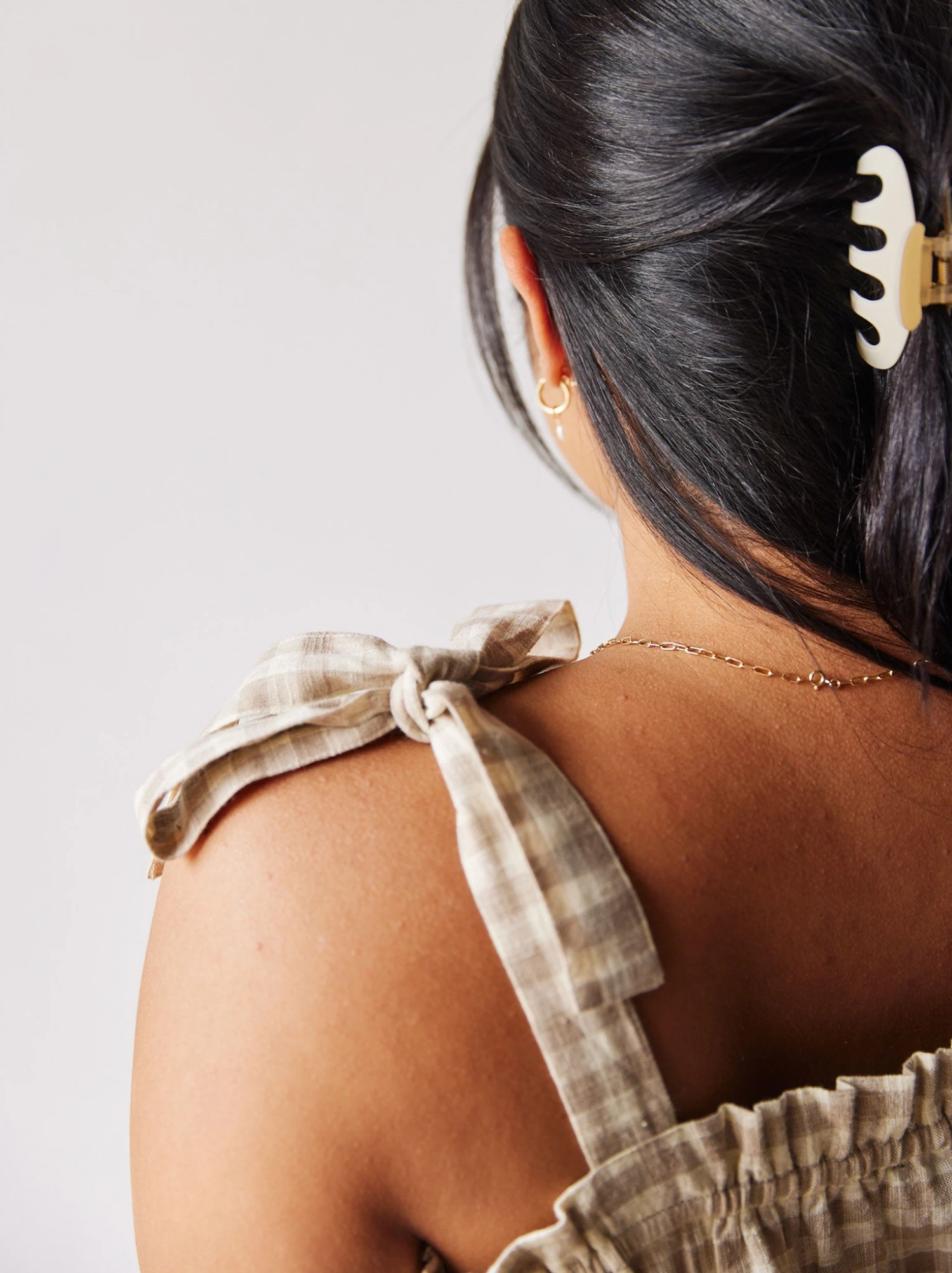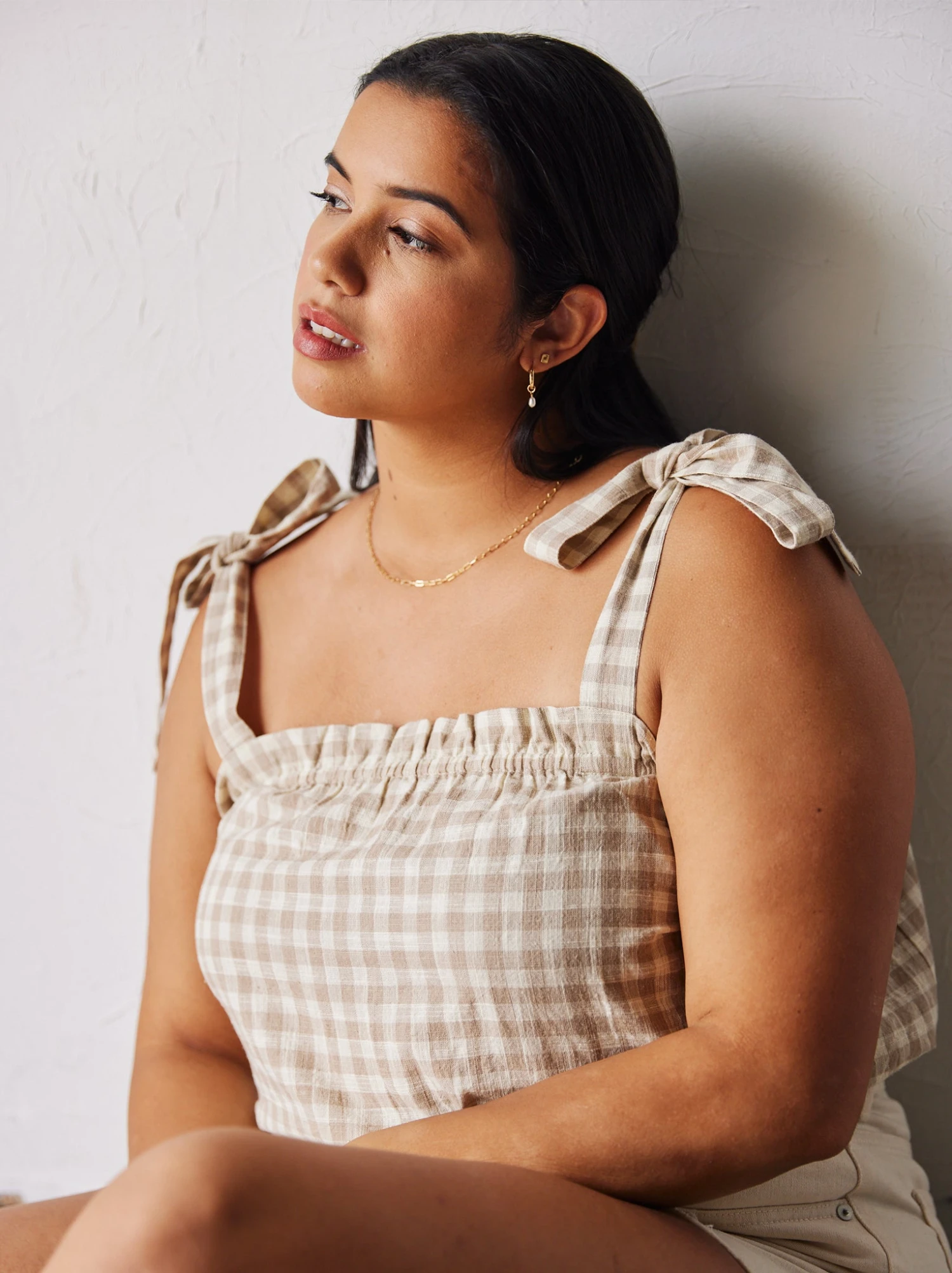 The Bryce is a full swing tank made in our breezy, linen-like cotton. The adjustable tie straps allow you to alter the fit and even tie into a halter top. Featuring smocking at the chest with a ruffle detail, the tank flares to a swing style, giving you a loose fit for those warmer days.