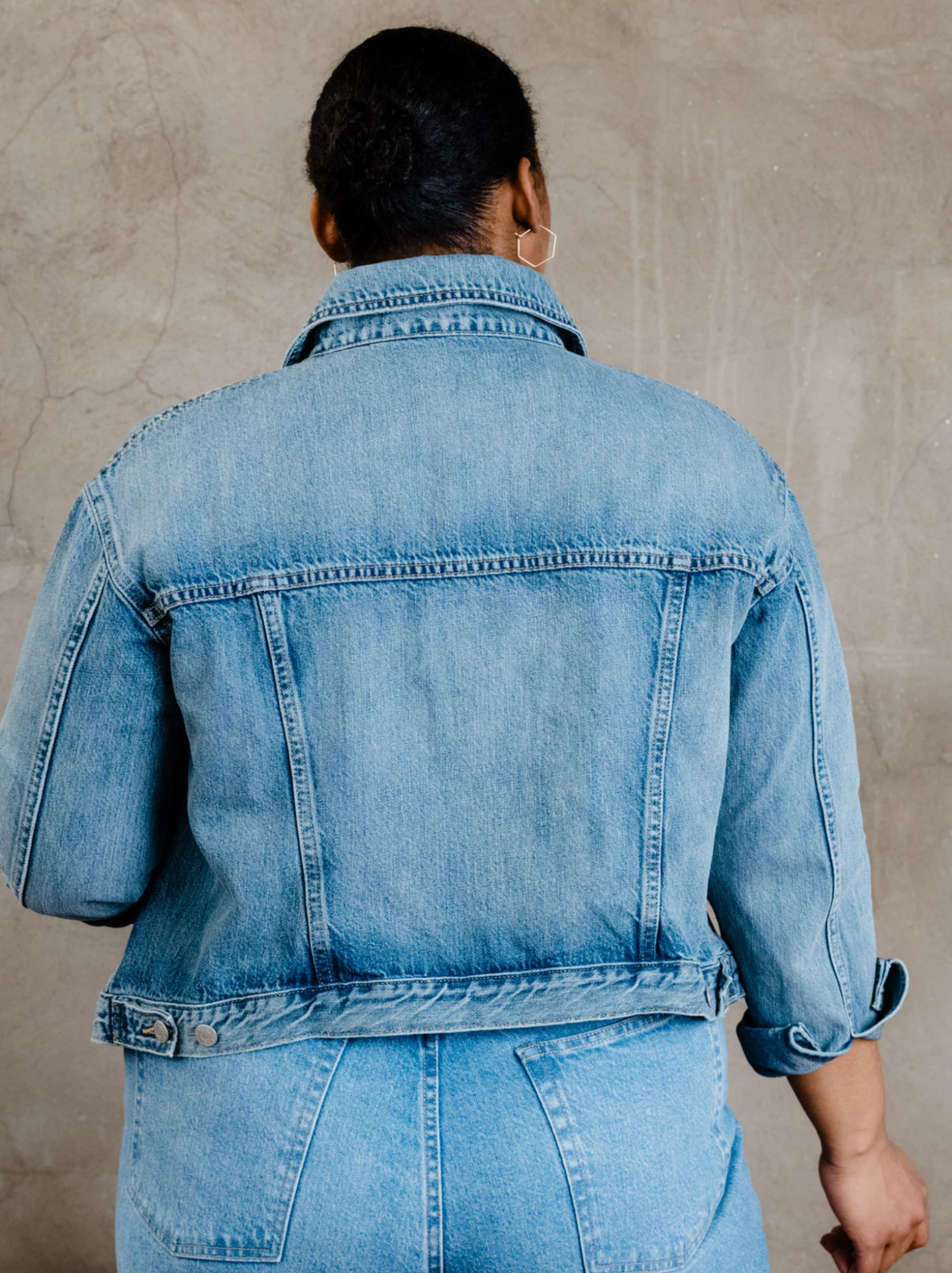 At just the right length to meet the high waist of your favorite jeans, this cropped denim jacket is a clean and casual wardrobe essential. Perfect as your go-to transitional layer, this jacket features a lived-in wash with relaxed drop shoulders and summary-through front patch pockets at the chest. Perfect silhouette to pair back to dresses and your favorite high waisted jeans. Style tip: wear as a shirt with high waisted jeans for a head to toe denim look.