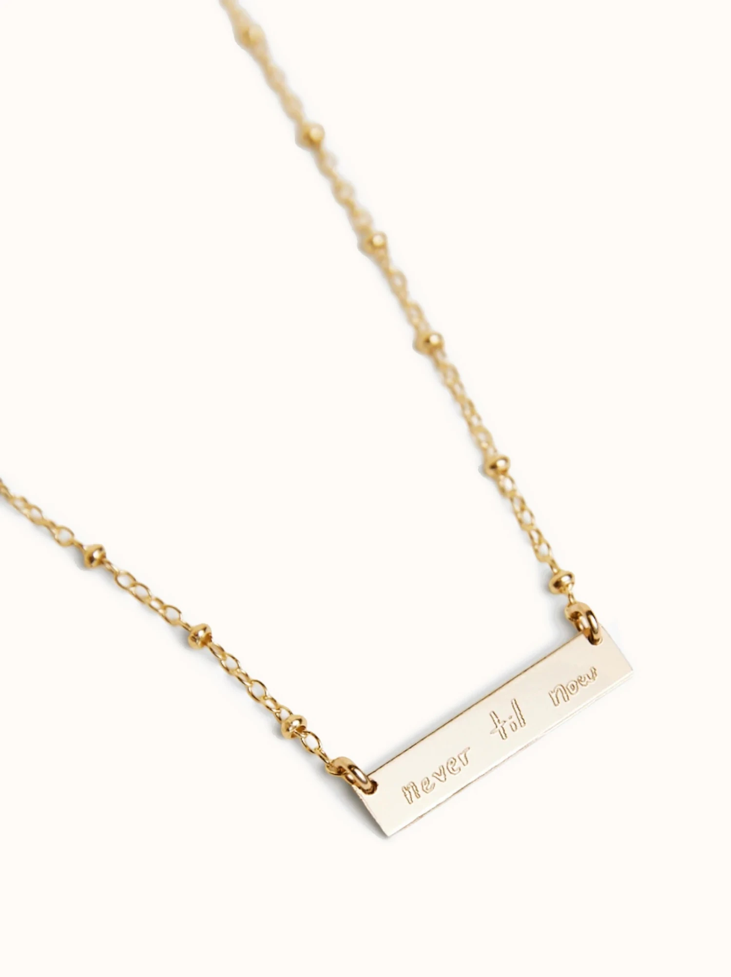 Designed to inspire, this gold-filled necklace features a metal plate engraved with Ashley’s lyric “Never Til Now” in her own handwriting for an added personal touch. With an adjustable satellite chain, this dainty piece is meant to be lived in and perfect for everyday wear. Wear with another necklace for a layered look.