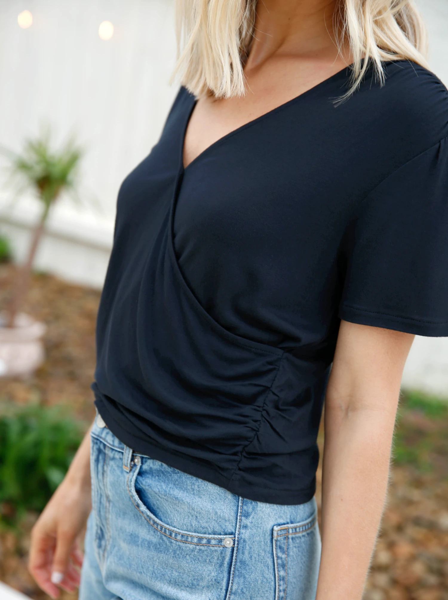 The perfect balance of comfort and style, this wrap front top is made with our high-quality, super drapey viscose that feels silky-smooth against your skin. The ruched detailing on the left side seam, shoulders, and sleeve cap add a touch of femininity and dimension to the top, making it stand out from a regular t-shirt. Quinn is the perfect solution for those who want to feel confident and put together no matter where you go.