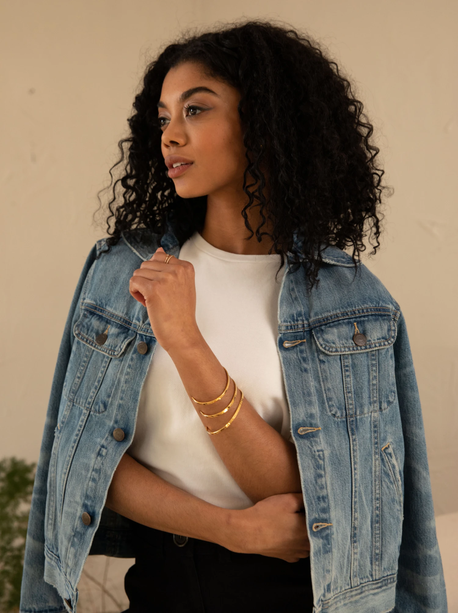 A perfectly textured bracelet stack: check! This set of three hammered cuffs adds interest and shine to any outfit. Not feeling a full stack that day? Wear one or two for a more casual look.
