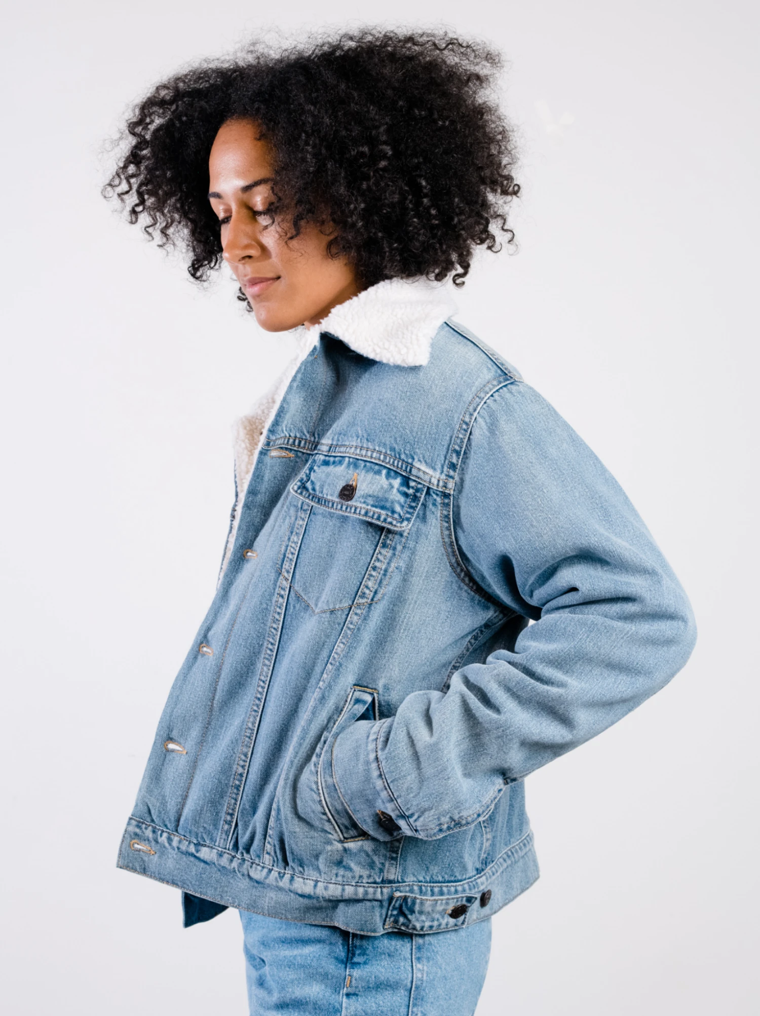 Featured in a classic trucker-inspired silhouette, this denim jacket is one you’ll reach for over and over again. With a vintage feel, medium wash, and cozy sherpa lining, this classic jacket offers the comfort and function of a trucker jacket with timeless denim styling.  Keeping you warm and cozy, this jacket is fully lined with soft faux sherpa and long sleeves featuring padded quilted lining.Â