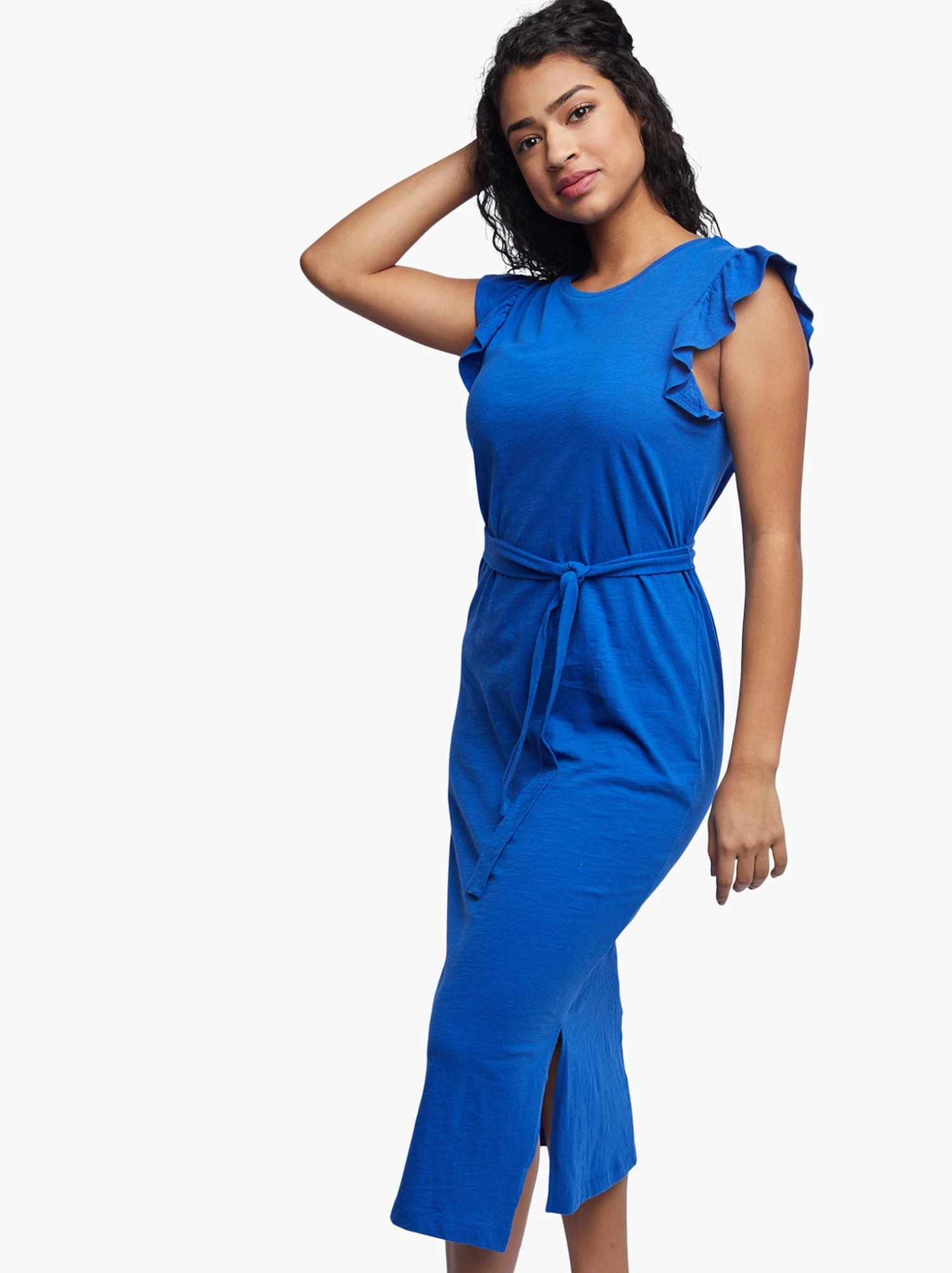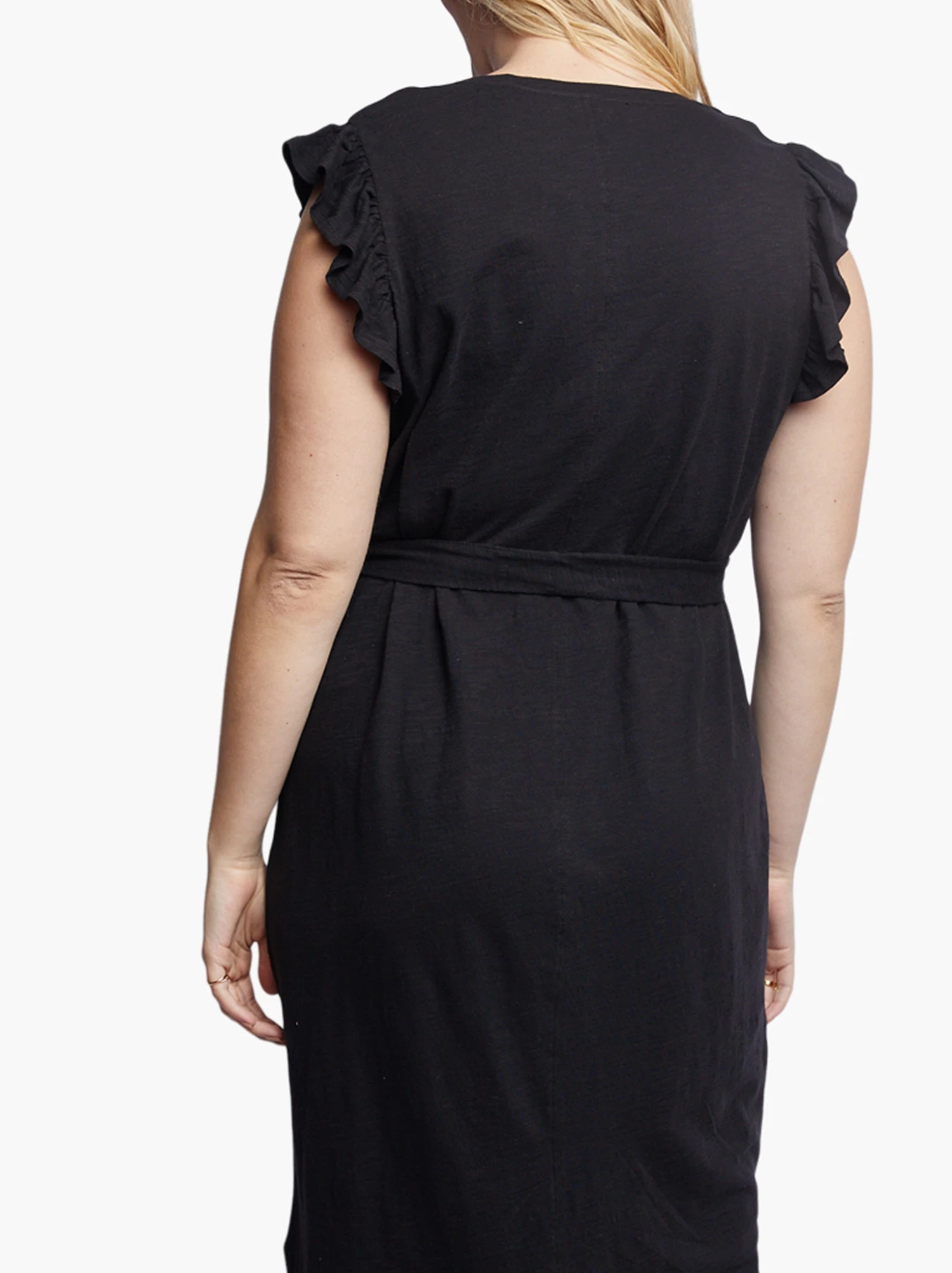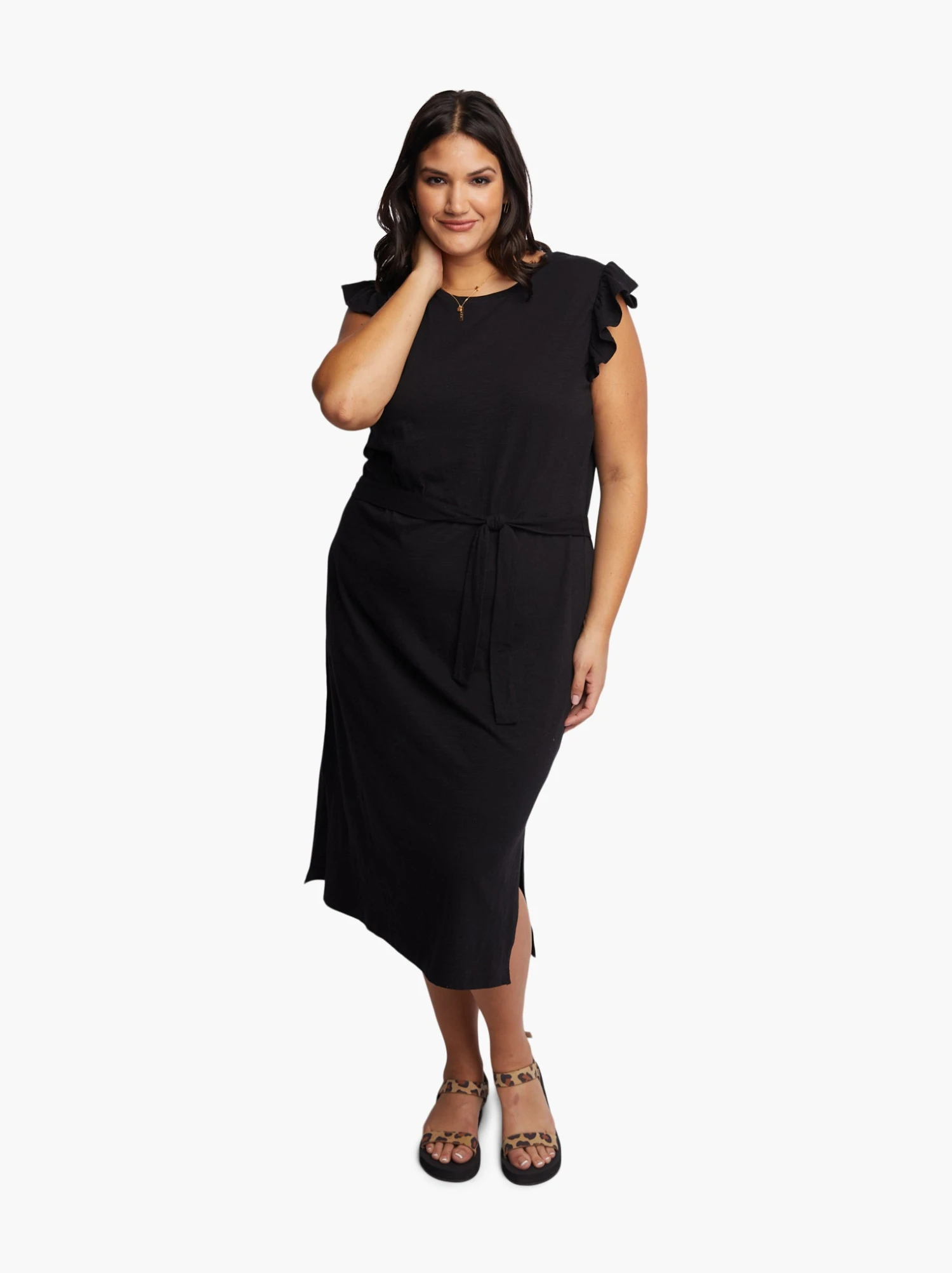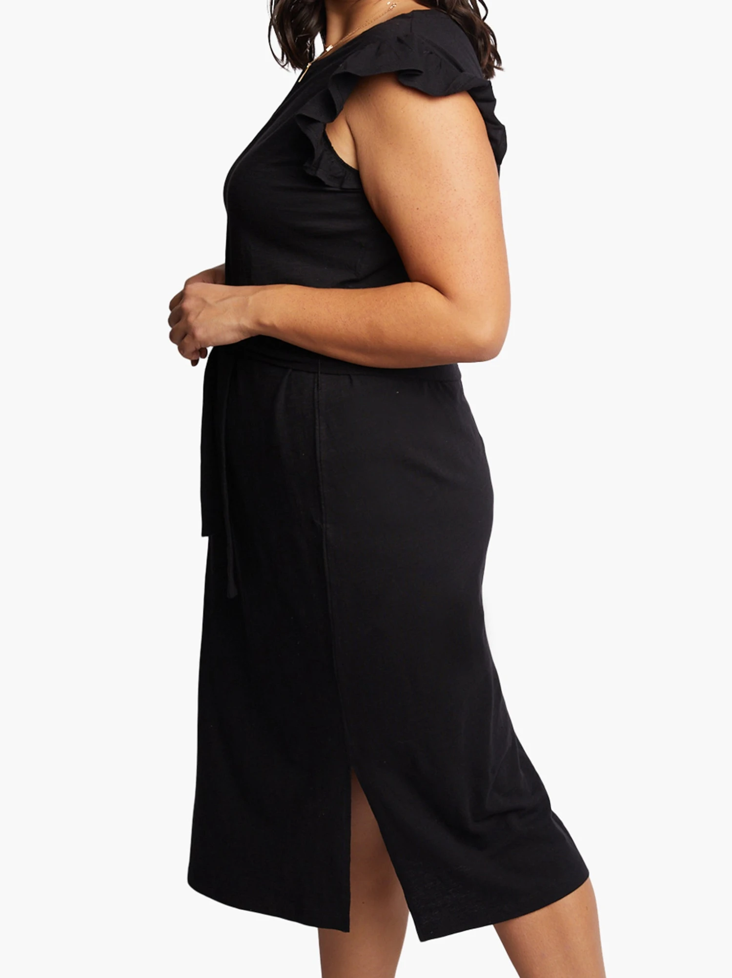 The Toni is a midi length column dress with ruffle sleeves. The removable belt allows you to adjust the waistline to the fit most comfortable to you. There are slits on the sides through the bottom of the skirt and the center seam adds detail to the back of the dress.